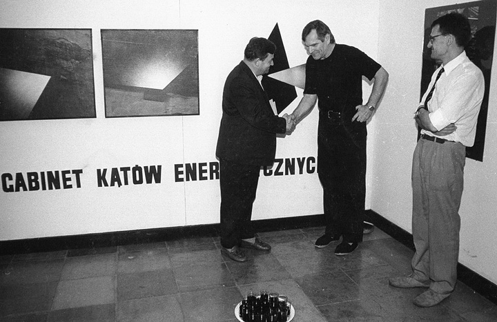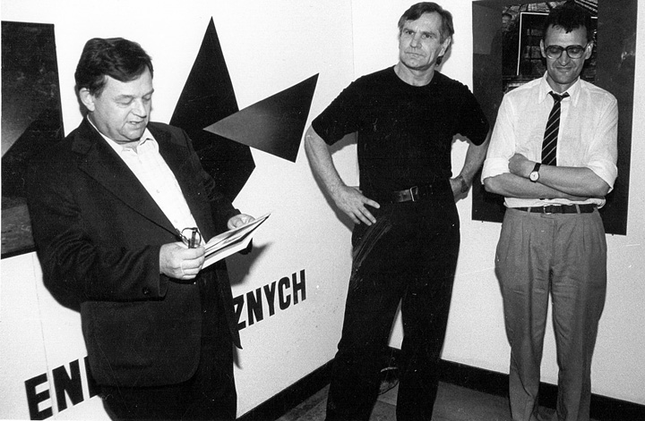 22Józef Robakowski - Gabinet katów energetycznych, Mała Galeria ZPAF, 7.06.1988. Od lewej: Paweł Pierściński (ówczesny prezes ZPAF), Józef Robakowski, Jacek Malicki. Fot. Krzysztof Wojciechowski.