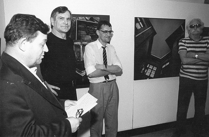 20Otwarcie wystawy Antoniego Mikołajczyka (z parasolem) w Małej Galerii ZPAF w Warszawie, 13.10.1987.