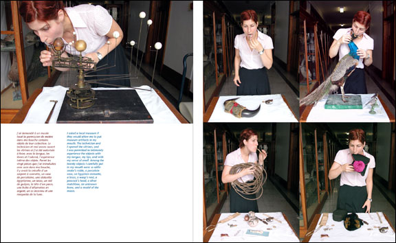 Poprosiłam miejscowe museum czy mogłabym włożyć do ust kilka eksponatów. Razem z technikiem otworzyliśmy witryny i otrzymałam pozwolenie intymnego doświadczenia przedmiotów za pomocą języka, ust i zmysłu węchu. Pomiędzy dwudziestoma eksponatami które delikatnie włożyłam do ust były: grzechotka grzechotnika, porcelanowz wazon, egipska statuetka, lasso, gniazdo osy, głowa pawia, srebrne pueło zapałek, nieznana koćś, i model księżyca.