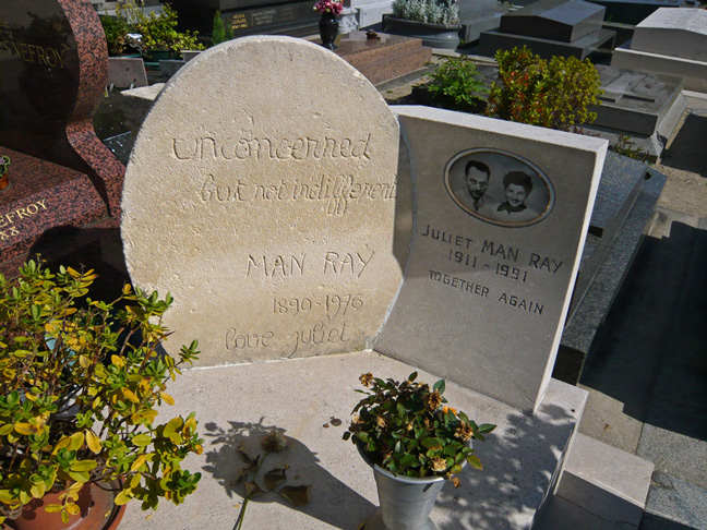 Tę pielgrzymkę po wystawach poświęconych Man Rayowi wypada zakończyć odwiedzeniem rue Campagne Première 31 bis, gdzie mieściło się pierwsze studio Man Raya w Paryżu. To ten wysoki budynek z przeszklonymi oknami. Niedaleko od tego budynku znajduje się cmentarz Montparnasse, na którym jest pochowany Man Ray (zmarły w 1976 roku), pod tablicą na której Juliet, jego żona, napisała "Unconcerned but not indifferent". Po swej śmierci (zmarła w 1991 r.) kazała dopisać "Together again".