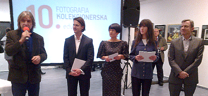 Od lewej: Prezes Okregu Warszawskiego Związku Polskich Artystów Plastyków Jacek Maślankiewicz, Rafał Kamecki reprezentujący Art.Info, Kasia Sagatowska i Katarzyna Majak, współorganizatorki aukcji, Krzysztof Madelski, kolekcjoner. Fot. K. Wojciechowski.Dziesiąta już Aukcja Fotografii Kolekcjonerskiej odbyła się prawie rok po poprzedniej i miała miejsce tak samo w warszawskim Domu Plastyka na ul. Mazowieckiej. Znajdująca się na drugim piętrze sala wystawowa umożliwiła zorganizowanie wystawy przedaukcyjnej w sposób klarowny, pozwalający objąć jednym spojrzeniem znaczną część ekspozycji. Prace były bardzo dobrze oprawione a co najważniejsze były to dobre prace, chociaż trudno byłoby ich wybór, np. w odniesieniu do kategorii „po 1990” uznać za odzwierciedlający stan polskiej fotografii. Właśnie wśród autorów prac powstałych po roku 1990 uderza znikoma liczba tych, który byli aktywni w latach 70. i 80. dwudziestego wieku. Nadal stosunkowo wyższe są ceny wywoławcze prac młodych autorów, co czasami uzasadniać mogą koszty produkcji (dibond itp.).